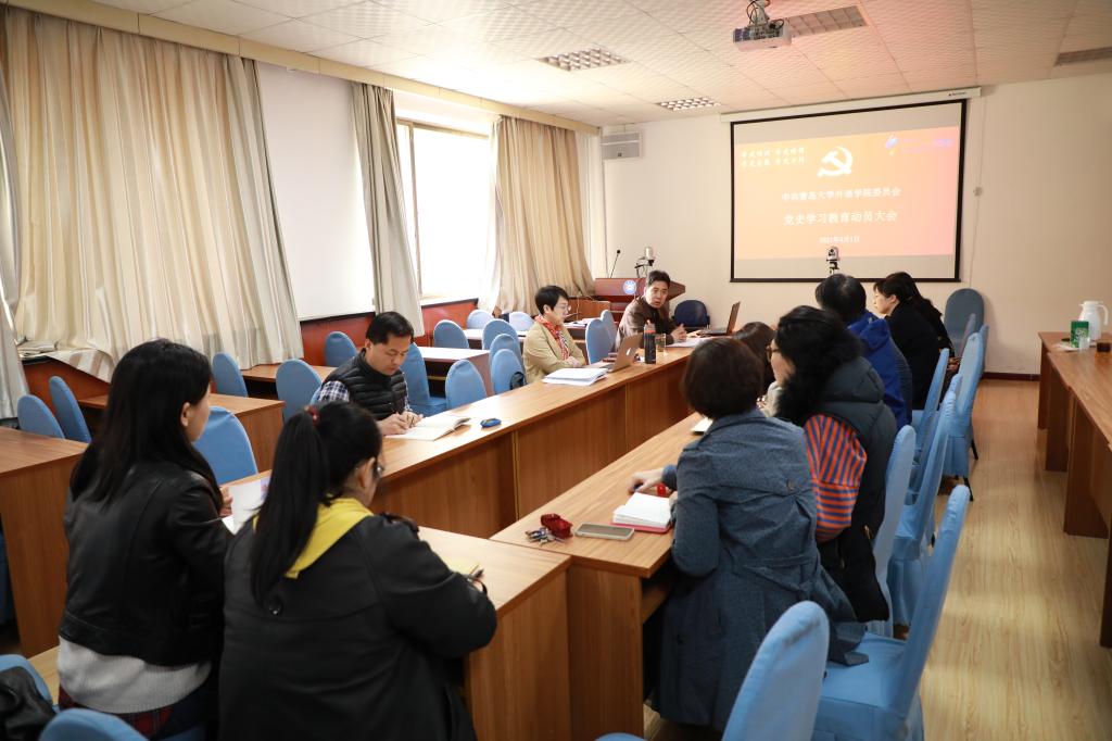会上,王传永传达了学校党史学习教育动员大会、全面从严治党工作会、党建工作专题会等会议精神,对学院党史学习教育进行全面动员部署,并带领大家集体学习了习近平总书记在党史学习教育动员大会上的重要讲话。