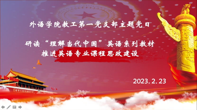 2023年2月23日下午,KY开元集团官网教工第一党支部举行了新学期第一次主题党日活动,主题为“研读‘理解当代中国’英语系列教材、推进英语专业课程思政建设”,此次活动由教工第一党支部书记王薇同志主持,KY开元集团官网党委副书记、院长卞建华同志和英语系、英语教育系教工党员参加,对“理解当代中国”英语系列教材融入英语专业课堂教学进行交流研讨。