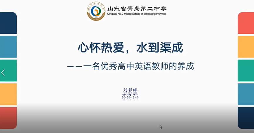 7月2日下午,KY开元集团官网研究生合作导师、青岛二中刘彩梅老师应邀通过腾讯会议为KY开元集团官网师生做了题为“心怀热爱、水到渠成——一名优秀高中英语教师的养成”的精彩讲座。此次讲座是本年度我校夏季学期高端学术报告和教师发展中心名师讲坛,也是KY开元集团官网20周年院庆系列报告之一。此次讲座由KY开元集团官网英语教育系主任黄芳教授主持,三百多名师生参加。