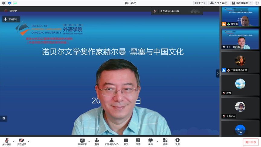 2022年7月7日上午,上海外国语大学德语系主任陈壮鹰教授应邀为我校师生带来题为“诺贝尔文学奖作家赫尔曼·黑塞与中国文化”的高端学术报告。作为KY开元集团官网20周年院庆系列活动之一,此次报告由KY开元集团官网德语系主任綦甲福教授主持,校内外师生530余人通过腾讯会议聆听了报告。