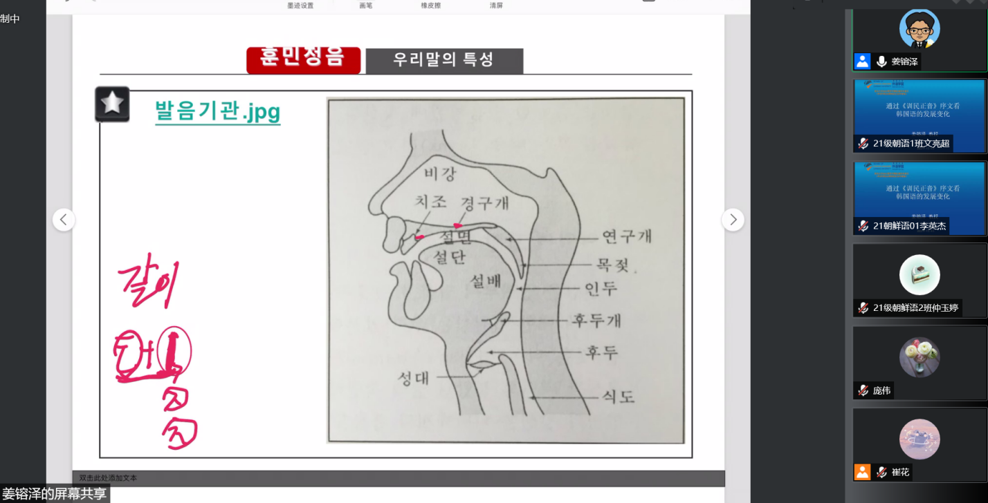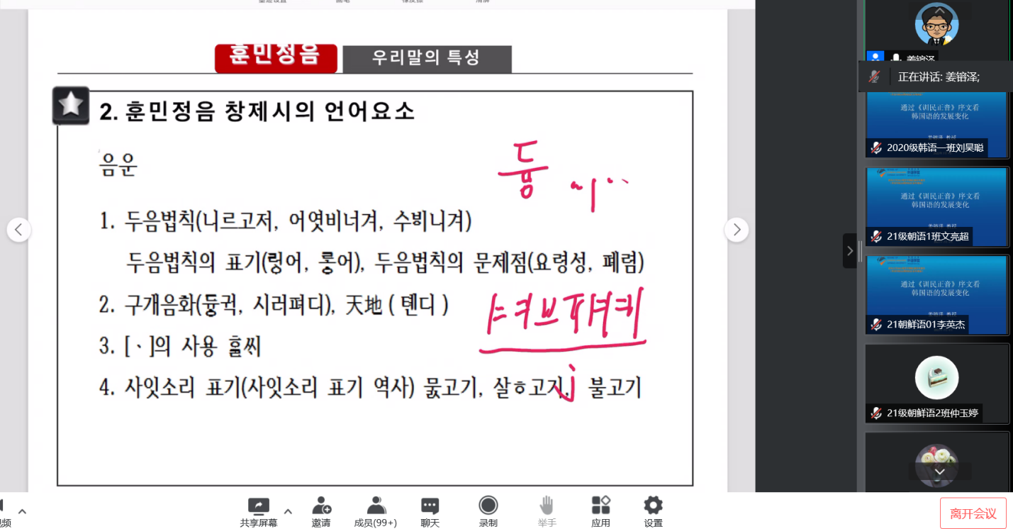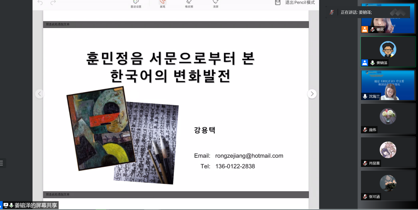 7月4日下午,中央民族大学中国少数民族语言文学学院姜镕泽教授应邀为KY开元集团官网朝鲜语系师生带来了题为“通过《训民正音》序文看韩国语的发展变化”的精彩学术讲座。此次讲座由朝鲜语系主任崔花老师主持,朝鲜语系多位老师以及全院学生通过腾讯会议参与了本次讲座。