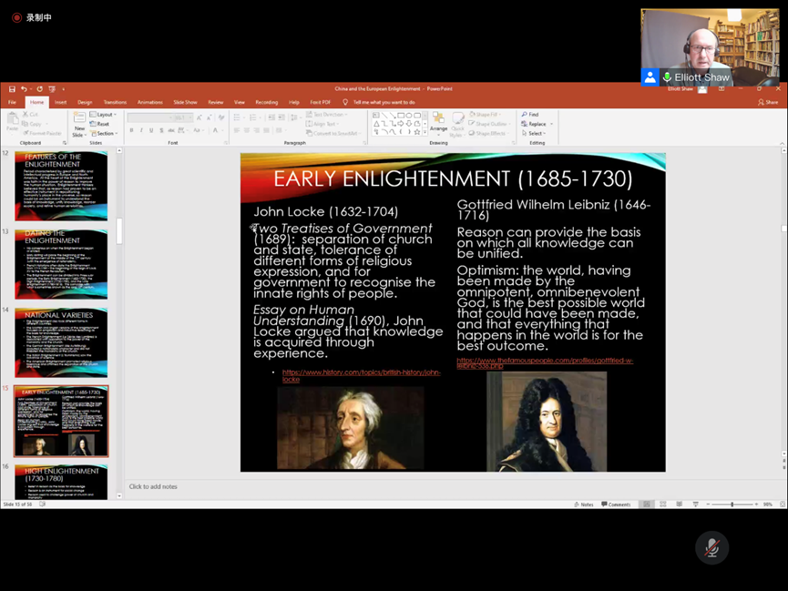 讲座伊始,Elliot Shaw教授以欧洲中世纪盛行的“地心说”为切入口,指出16、17世纪哥白尼、伽利略及牛顿等科学家的观点和研究对当时人们的自我认知产生极大的影响,如帕斯卡尔指出,“日心说”改变了人们对自己在宇宙中所处地位的看法,而理性主义代表笛卡尔和斯宾诺莎则通过强调人的理性与思考来捍卫人的尊严。通过以上科学家、哲学家的观点,Elliot Shaw教授引入本次讲座的主题——启蒙运动。Elliot Shaw教授以时间为节点,将欧洲启蒙运动分为三个阶段,并逐一介绍了三个阶段的总体特征以及主要启蒙思想家的核心观点。