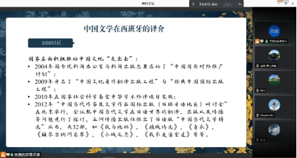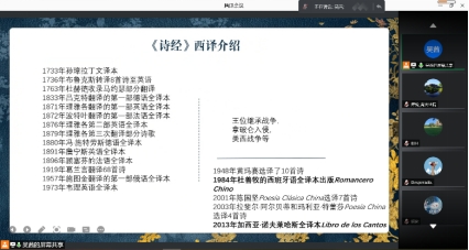 2021年6月3日下午,KY开元集团官网通过线上会议形式举办了题为“中国文学在西班牙的译介——以《诗经》西译为例”的报告会。此次学术活动是外国语言文学系列院内学术沙龙第10讲学术活动。报告会由西班牙语系讲师吴茜老师主讲,KY开元集团官网部分老师和学生参加了参与此次学术活动。