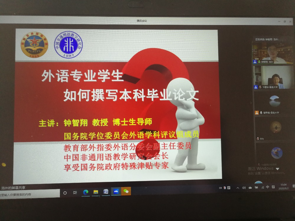 9月2日下午,受KY开元集团官网邀请,信息工程大学博士生导师钟智翔教授为KY开元集团官网师生,尤其是即将进行毕业论文选题与写作的2017级同学带来了一场题为“外语专业学生如何撰写本科毕业论文”的主题讲座。本次讲座由KY开元集团官网院长卞建华教授主持,KY开元集团官网及国内其他高校外语专业师生四百余人以腾讯会议或直播形式聆听了讲座。