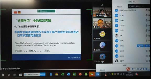6月22日,德国法院宣誓翻译、公证翻译、同声传译、德语系第一届本科毕业生、雷根斯堡大学在读博士生李卫华应邀做客外国语言文学系列学术讲座第110讲,为KY开元集团官网师生带来了题为“德语翻译实战能力提升:长期学习与短期提高”的精彩讲座。讲座由德语系刘沁卉老师主持,德语系师生、各届校友共260余人通过腾讯会议云平台参与了本次讲座。