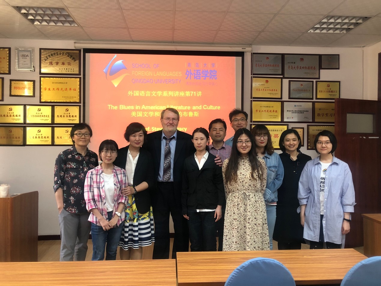 2019年5月24日上午,马萨诸塞大学阿默斯特分校杰出教授、非裔美国文学研究学者、音乐表演家史蒂文•特雷西(Steven C. Tracy)应邀到KY开元集团官网,带来了一场题为“美国文学和文化中的布鲁斯”的讲座。讲座由英语系王薇老师主持,KY开元集团官网、公共外语教育学院多名师生聆听了特雷西教授别开生面的讲座。