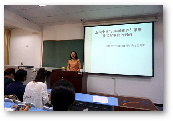 9月27日下午,延边大学人文社会科学学院历史系姜秀玉教授应邀做客外国语言系列学术讲座第48讲,在博文楼403教室作题为《近代中国“开眼看世界”思想对朝鲜的影响》的专题讲座。副院长李明学主持,学院部分教师及韩语专业的70余名师生聆听了此次讲座。