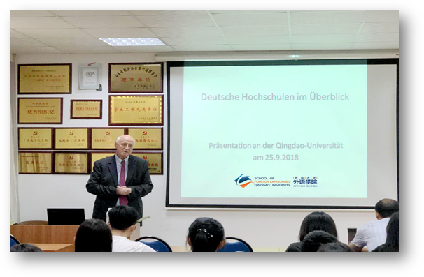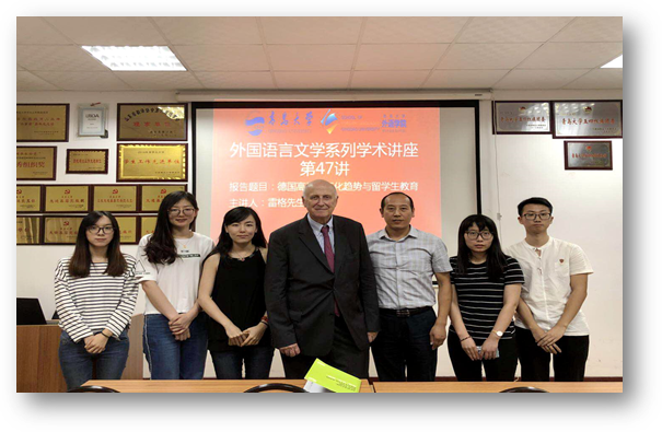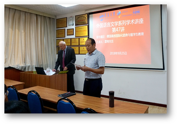 9月25日下午,德国弗里茨-蒂森基金会董事会前主席雷格先生应邀主讲KY开元集团官网外国语言文学系列学术讲座第47讲,在博文楼312会议室举行作题为《德国高校国际化趋势与留学生教育》主题讲座。德语系主任綦甲福教授主持,德语系50余人聆听了本次讲座。