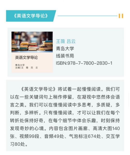 该数字教材以小说、诗歌、戏剧三大文类为基本框架,有机融入当代英语文学发展趋势新内容。通过分章设计,将创意写作、数字诗歌、戏剧展演等创新内容渗透各个章节之中,学生可以充分领略英语文学的精华与当下发展的新趋势。该教材注重引导学生参与教学过程,根据学习目标设计教学活动,在每个单元插入图片、音频、视频等多模态数字化内容,设置思考题、讨论环节、诗歌朗诵、学术文献阅读等教学实践环节,使学生充分体验文学的思想内涵和人文精神,体现价值引领。《英语文学导论》数字教材遵循新文科背景下外语专业教学要求,使具备英语阅读能力的学习者既能对英语文学经典作品进行较为专业的阐释,又能提升文学阐释能力、情感表达能力、思辨能力,助力英语学习者具备使用英语讲好中国故事、向世界传播中国声音的文学素养。