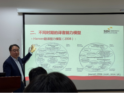 随后,孟教授详细阐述了不同时期的10种译者能力模型。他剖析了各模型的独特之处及其在当下翻译实践中的运用情况,彰显出翻译行业对译者的要求日益严苛与多元。这不仅表明了译者需要扎实的语言功底,更需具备跨文化交际、相关专业领域知识以及技术应用等多方面的能力。此外,孟教授还具体阐释了译者能力模型在德国综合性大学与应用型大学翻译课程设置中的不同体现,尽管不同课程各有侧重,但都共同构建起多元化的翻译人才培养体系。