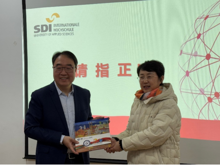 在报告尾声的师生提问环节,现场气氛热烈非凡。孟教授耐心倾听师生们关于翻译信息检索、翻译职业规划、翻译理论研究现状等方面的问题,并一一给予详尽且富有启发性的解答。提问环节结束后,卞院长向孟教授赠送了鲁巴教育合作项目30周年图册,象征着双方在教育交流合作中的深厚情谊与丰硕成果。最后,在场部分师生与孟教授一同合影留念。