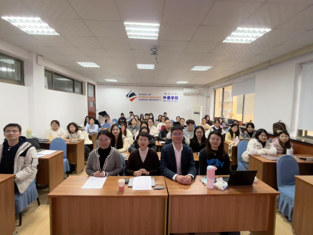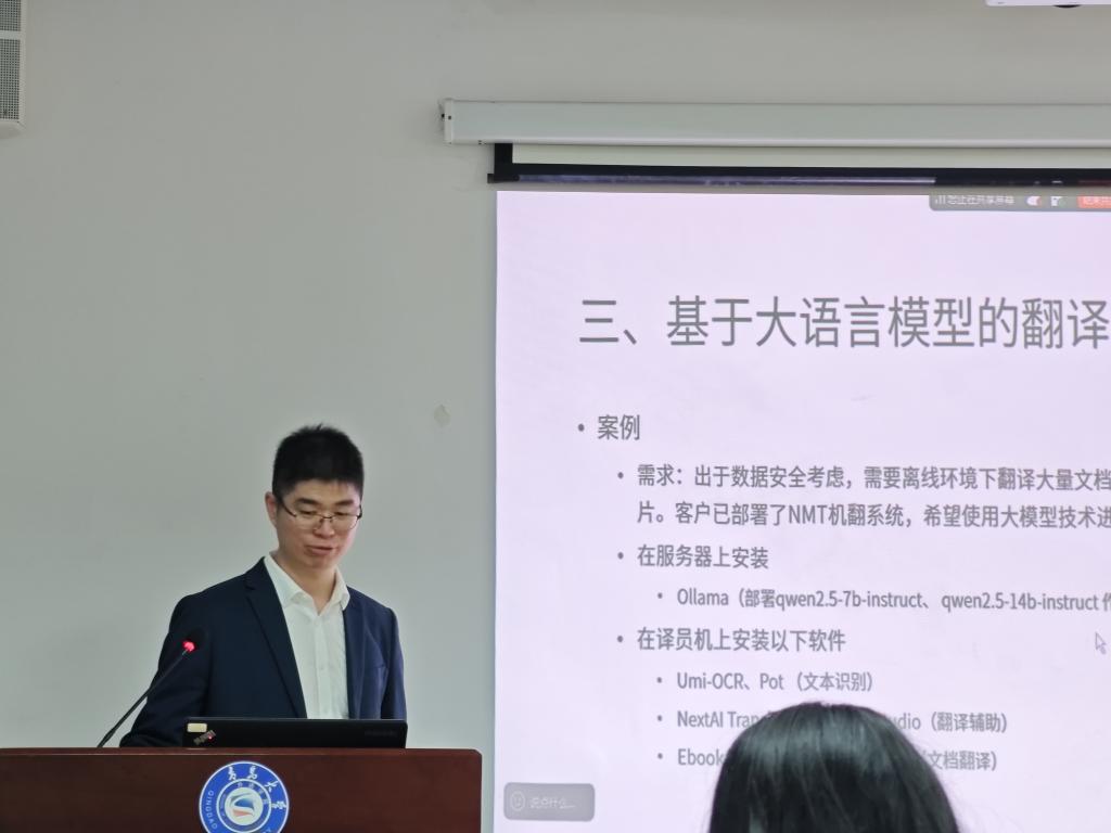 12月20日下午,郭老师通过“大语言模型助力翻译实践”的主题,带领学生深入探讨神经网络机器翻译、翻译终端产品与大语言模型的关联应用,同时着重强调了人类译员的重要价值。