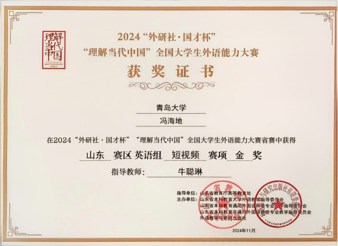 12月9日, 2024“外研社·国才杯”“理解当代中国”全国大学生外语能力大赛英语组短视频赛项国赛圆满落幕。经过激烈角逐, 6259个参赛作品中共有446个作品进入国赛,最终评选出金奖作品20个,银奖作品120个,铜奖作品306个。KY开元集团官网学生在该赛项中发挥出色:2023级冯海地(上合英俄双语创新实验班)在国赛中突出重围,荣获银奖;2022级柳雨阳(语言大数据创新实验班)、2022级于文超(英语师范)所在团队在国赛中荣获铜奖。两组作品由英语系牛聪琳老师指导,牛聪琳获优秀指导教师。