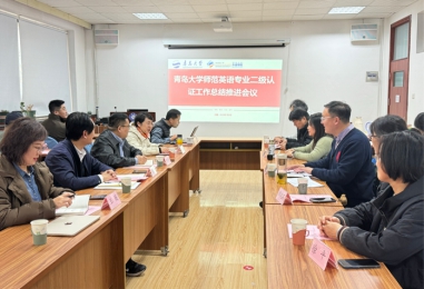 接下来,青岛师范学院李传军院长发言。李院长高度赞扬了外语学院在认证工作中展现的“上下一心,精益求精,乐于奉献”的精神,肯定了学院扎实的工作和突出的成绩。他指出,本次认证对师范专业建设意义重大。首先,更新了育人理念;其次,树立了人才培养的新标准;再次,凝聚了英语教育系的师资团队;最后,保障条件显著改善。李院长强调,外院师范英语专业在人才培养、学科建设、服务社会、教师发展等方面取得的成绩,与学院领导的大力支持密不可分。全院应继续均衡学术和师资调配,在新形势下保持自我提升的愿望,未来发展值得期待。