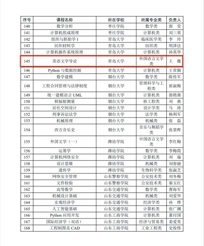 近日,山东省高等教育学会公布了2025年山东省智慧课程拟认定名单,KY开元集团官网王薇教授担任负责人的《英语文学导论》课程成功获批。此次全省共评选确定200门课程为山东省首批智慧课程,KY开元集团官网5门课程获批。