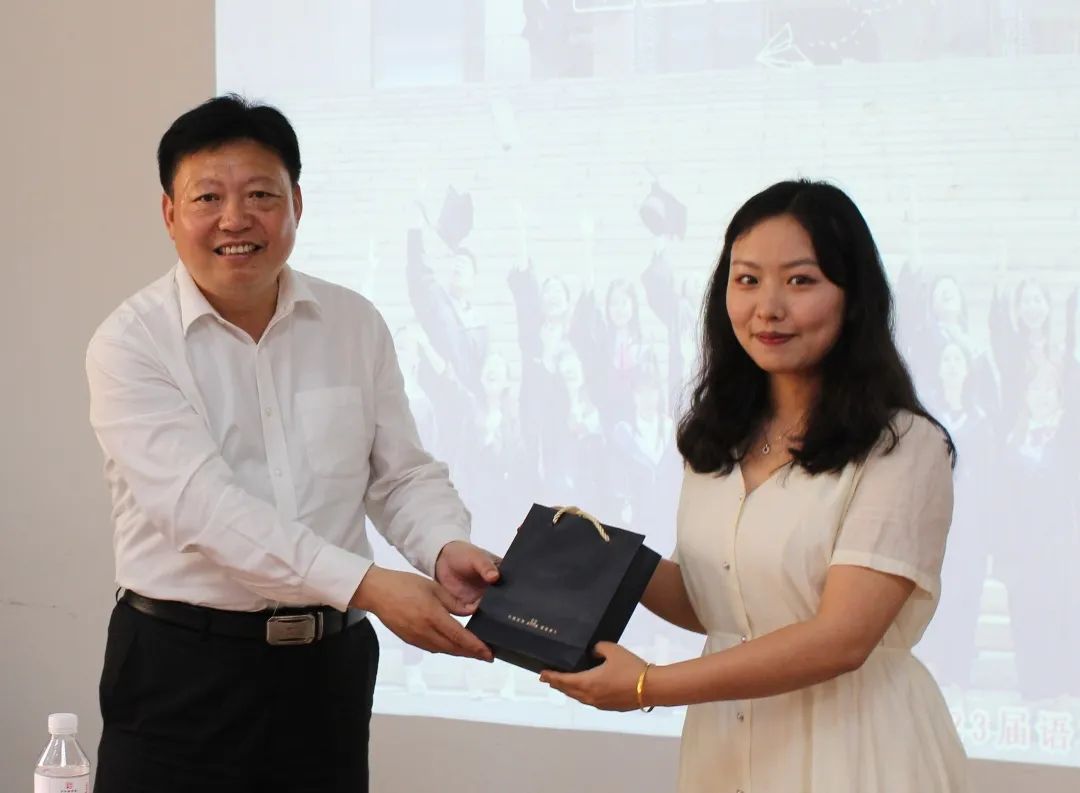 班会最后,英语(语言大数据)创新实验班学生代表李俣霏将凝结班级四年成长与对母校感恩之情的《致母校的一封信》交予母校,陈涛代表学校向同学们赠送了代表着青大文化和青大精神的文创产品。陈涛嘱咐同学们无论毕业后身在何处,工作在什么岗位,都要记得培育我们的母校,母校也会时刻关注着大家,支持大家的进步和发展,青大永远是大家的精神家园和坚强后盾。