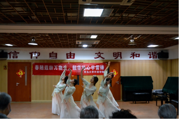 怀着满腔热情,志愿者同学们为福彩南山养老院的老人们带来了一片温暖春意:精心准备的老歌《鸿雁》,点燃在座老人们的欢快氛围;一曲《愿逢山河》,舞出一片江山静好,更有老人们即兴点歌环节,唤醒老一辈人的红色记忆……节目中,更有志愿者分发精心准备的水果,大家欢声笑语,笑容此起彼伏……