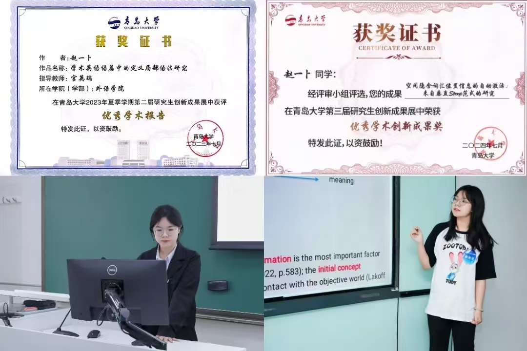 在导师认知语言学与文体学方向研究的影响下,我逐步确立了以认知语言学为理论基础,融合心理语言学实验、语篇分析、翻译研究与语料库实证方法的研究视角,尝试从语言现象中挖掘认知规律,并将其服务于教学与实践。围绕这一研究路径,导师与我合作开展多项实证研究:我们在AMI期刊 Contemporary Social Sciences上发表了关于中外应用语言学期刊摘要中名词化策略对比的研究,揭示了文化背景对学术表达方式的深层影响。我们基于语料库研究定义句的局部语法模型,补充并完善了既有的定义标记系统,为学术英语写作的教学与研究提供了结构化路径,相关成果发表在Scopus-Q3期刊 The International Journal of Communication and Linguistic Studies上。此外,我们将体认语言学视角引入古典诗歌翻译研究,探讨译者在主客观性之间的动态调节;同时也关注认知语义与教学实践的结合,以“down”为例分析其在学术语篇中的图式结构与隐喻路径,为词汇教学提供理论支持。