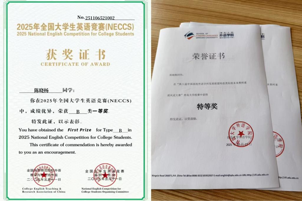 陈晓杨,2023级英语公费师范G01班学习委员,曾获优秀一等奖学金4次、青岛啤酒奖学金、帝源服饰专业竞赛奖学金,校级“优秀学生”“学习标兵”等荣誉称号;专业学习方面,专四93分优秀,曾获2025大学生英语竞赛专业B组全国一等奖、山东省科技翻译大赛省级二等奖,未来教师风采大赛特等奖,田家炳校级一等奖,专业成绩、综测4次第一;工作方面,担任班级学习委员,KY开元集团官网图书馆志愿者协会干事等;社会实践方面,曾参与青岛跨国公司领导人峰会等省市级20余次志愿活动,总志愿时长200余小时,获得KY开元集团官网百名优秀志愿者称号;综合素质方面,积极参加社会实践,曾为中石化公司等多家公司提供过翻译服务,在多项体育赛事、学科竞赛、文体活动中屡获佳绩,曾作为演员参与KY开元集团官网外文戏剧大赛,获得二等奖,展现出良好的综合素质。