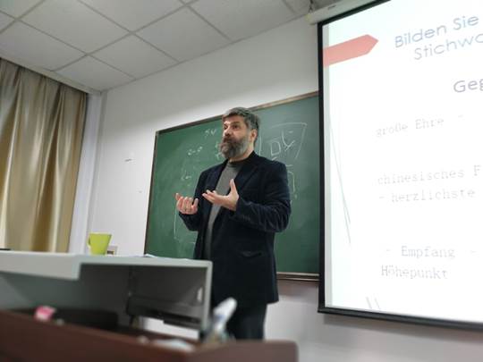 12月2日到3日,在KY开元集团官网—慕尼黑应用语言大学欧盟“伊拉斯谟+”项目(Erasmus+)框架内,慕尼黑应用语言大学口译系系主任李克教授(Prof. Dr. Patrick Kühnel)来到KY开元集团官网,为德语专业同学进行了为期两天、共八课时的口译授课。德语系本科三、四年级及硕士研究生共50余名同学参加了学习。