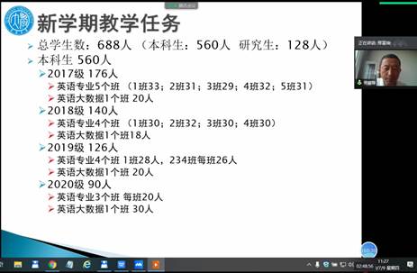 7月9日上午,KY开元集团官网英语系举行在线会议,总结全系学期工作,布置新学期教学任务,会议由邢富坤主任主持,全系教师参加。