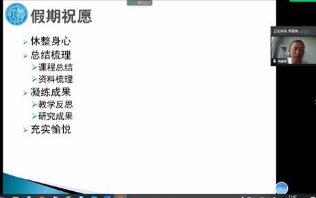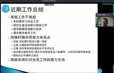 邢富坤将本学期工作总结为“常规工作不常规,特殊时期共同努力有亮点”,并从教学、科研和内部建设等方面介绍了全系主要工作,表扬了表现突出的教师。重点布置了新学期教学任务,提出新学期的在教学改革、人才培养、科研学术、内部建设等方面的具体目标与任务,希望大家利用暑期休养身心的同时,做好教学准备工作,为新学期工作打好基础,并祝愿全体教师度过一个充实愉悦的暑假。