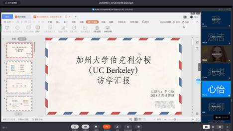 会议伊始,2018级英语专业李心怡同学分享了她在美国加州大学伯克利分校的公派留学经历。李心怡同学认为,国外的教学理念、模式和方法有很多可供借鉴之处,尤其是严格的教学要求和多样化的教学形式让其印象深刻。