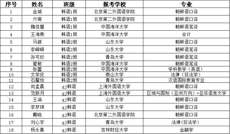 朝鲜语系顺利通过2020年全国硕士研究生招生考试情况一览表