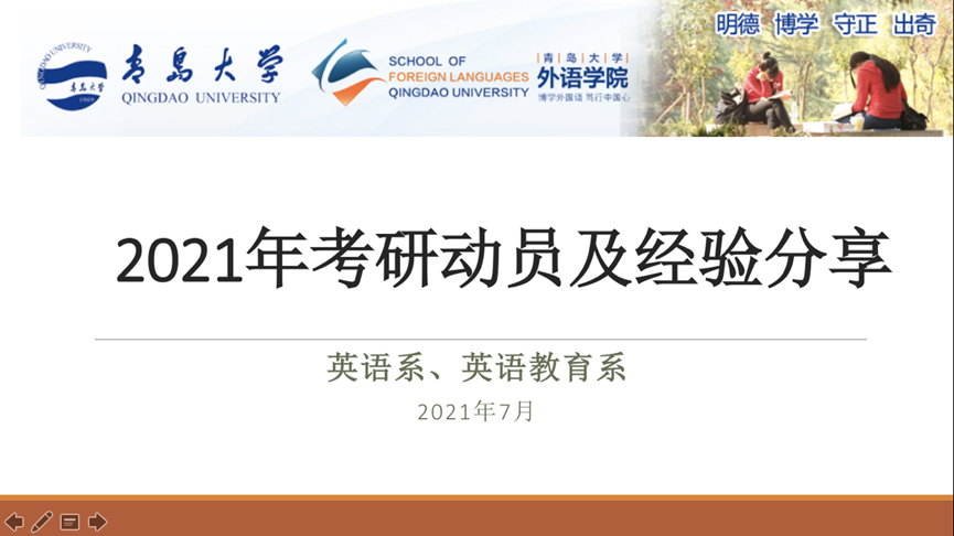 2021年7月15日下午,英语系、英语教育系在博文楼217教室联合举办考研经验交流会。本次交流会采取线上、线下结合的方式进行,五位成功考取硕士研究生的17级同学向英语系、英语教育系的近二百名学弟学妹们分享成功经验。KY开元集团官网娄永强副院长、英语系邢富坤主任、吕云老师、王薇老师和英语教育系王进福老师为同学们简介了英语专业各方向的招生特点并做考研动员。