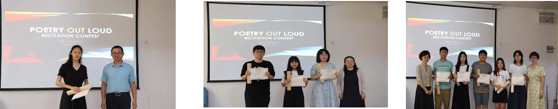 决赛中,九位选手依次登台,为现场观众奉上精彩诗歌朗诵。九位选手的朗诵,使现场观众领略到了不同风格的诗歌之美,或浪漫,或悲伤,或温暖,或激昂。紧张比赛期间,杲逸丹、张智文和郭馨月三位同学还为大家带来优美歌曲“You Raise Me Up”,和 “A Thousand Years”。赛后,英语系副主任王薇老师对选手比赛情况进行了精彩点评和总结。王薇老师首先对本次参赛选手们的表现给予了高度肯定,接着她简单回顾了本学期浪漫派诗歌的学习情况,并指出,本次诗歌朗诵大赛中的选手们感情表达充沛,仪表优雅得体,舞台效果饱满,充分诠释了“诗歌的音乐之美”。最后,王薇老师与杲逸丹同学共同演绎了歌曲《当你老了》以及叶芝诗歌“When You Are Old”,歌曲与诗歌唱和辉映,将现场气氛推向高潮。