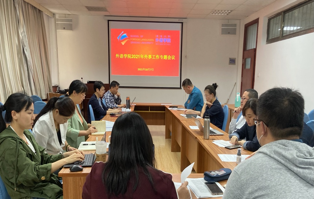 各系负责外事的主任或副主任依次汇报本系外事发展现况。英语系刑富坤主任分析英语系外事工作中的问题,建议加强外教职业道德考核,聘用教学与科研并重型外教;日语系杜雪丽副主任提出日语系受疫情影响学生交流外派受限,与日本上智大学合作停滞,希望近期重新启动该项目的推进工作,并尽快签署合作交流协议;朝鲜语系杨昊副主任表示疫情前朝鲜语系学生国外交流热情高,教师访学活动较多,“十四五”计划提高朝鲜语系聘任外教学历;德语系刘沁卉副主任介绍德语系“十四五”期间外事工作目标和具体工作计划,将继续推进现有项目,在疫情防控允许的情况下,组织教师互访和学生选派,聘用高级外籍专家,推进中华外译合作申报,探索疫情期间线上课程等多种形式;法语系段丽君主任介绍法语系现有公费、自费学生合作项目、教师挂职及访学、新开拓项目以及谈判中项目的“十四五”展望;西语系陈皓主任和栾勋业副主任提出西语系目前受疫情影响,师生互派项目停滞,提出探索聘用合作学校外教的可行性,提议联合培养硕士项目,建议恢复招生人数以及适当增加省外招生。