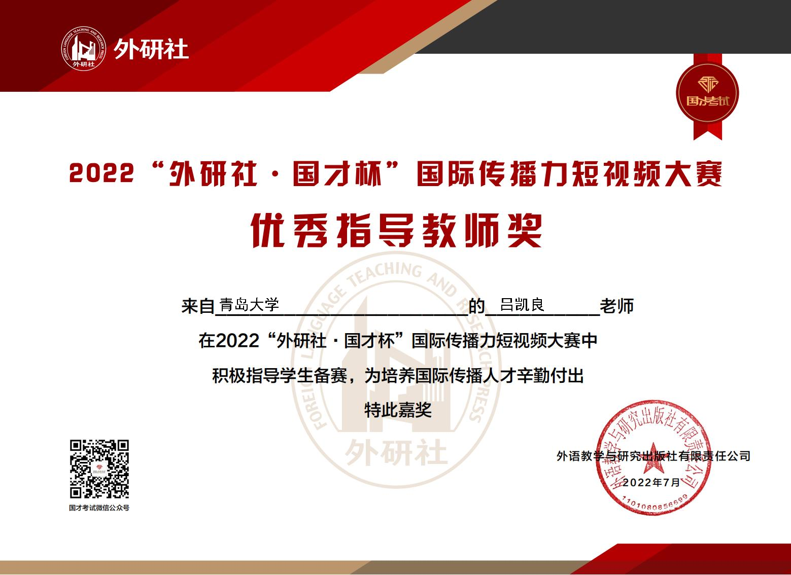 7月1日,2022“外研社·国才杯”国际传播力短视频大赛复赛结果公布。KY开元集团官网英语教育系20级学生刘晓艺通过初赛和复赛,过五关斩六将,最终取得全国二等奖的好成绩。吕凯良老师获优秀指导教师奖。