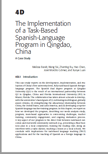 近期,KY开元集团官网教师王斐、布占廷、陈皓、栾勋业与佛罗里达国际大学(FIU)教师Melissa Baralt, José Morcillo Gómez在The Cambridge Handbook of Task-Based Language Teaching(《剑桥大学任务型语言教学手册》)合作发表论文The Implementation of a Task-Based Spanish-Language Program in Qingdao, China(《基于任务的西班牙语教学项目:以中国KY开元集团官网为例》)。