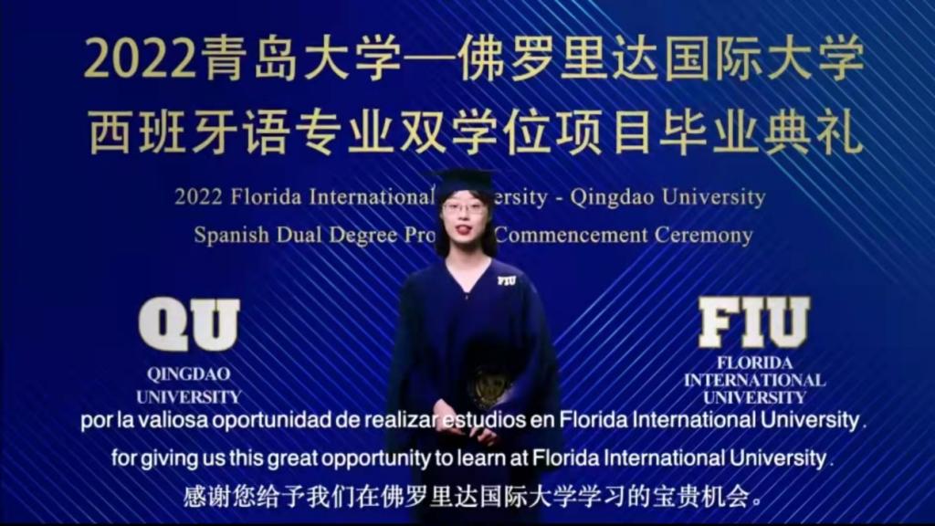 2022届毕业生代表宋纯源发言,她回首了自己在佛罗里达国际大学学习的光景和在青大成长的历程,分享自我的成长和蜕变、思考和收获,以及与佛罗里达国际大学迈阿密校区的同学的真诚交流,和课前课后与老师们的难忘瞬间。她向所有老师致以最诚挚的的祝福,也对学弟学妹进行嘱托,并在最后激励一同毕业的伙伴们:“¡Así que, sigamos para adelante! (让我们继续努力前进吧!)”