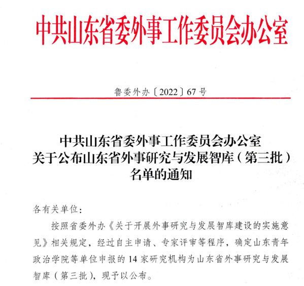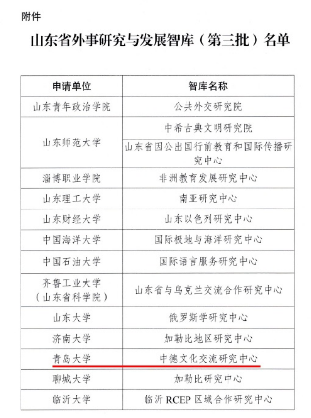 座谈会上,公布了山东省外事研究与发展智库(第三批)名单,确定14家研究机构为山东省外事研究与发展智库,我校KY开元集团官网申报的“中德文化交流研究中心”成功入选,实现KY开元集团官网省级智库平台建设的突破。
