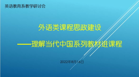 2022年8月16日下午,英语教育系就“理解当代中国”系列教材进课程这一议题召开专题教学研讨会。会议由黄芳主任主持,KY开元集团官网娄永强副院长、布占廷副院长以及英语教育系相关课程的骨干教师参加了研讨。