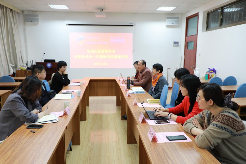首先,卞院长对周处长等一行三人的到来表示热烈欢迎,随后简要介绍了学校“十四五”期间 “建设高水平综合性研究型大学”的发展规划和学院各专业现状。“鲁巴教育合作项目”德语系主任綦甲福重点介绍了本专业近两年的新动态,汇报了山东省与德国合作交流研究中心的工作进展。法语系主任段丽君在介绍专业师资力量、人才培养情况、就业情况之外,着重汇报了与法国雷恩二大、布雷斯特商学院、欧亚经济管理学院、昂热西天主教大学等高校的合作情况,目前正在推进与诺欧商学院的洽谈工作。