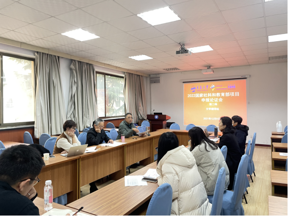 2021年12月9日下午,KY开元集团官网召开2022年度高层次项目申报论证会。中国海洋大学任东升教授、于国栋教授,以及KY开元集团官网徐莉娜教授、邢富坤教授、王乐教授、王薇副教授应邀出席会议,担任论证专家。论证会分为文学与翻译组和语言学组进行,分别由KY开元集团官网卞建华院长和布占廷副院长主持。