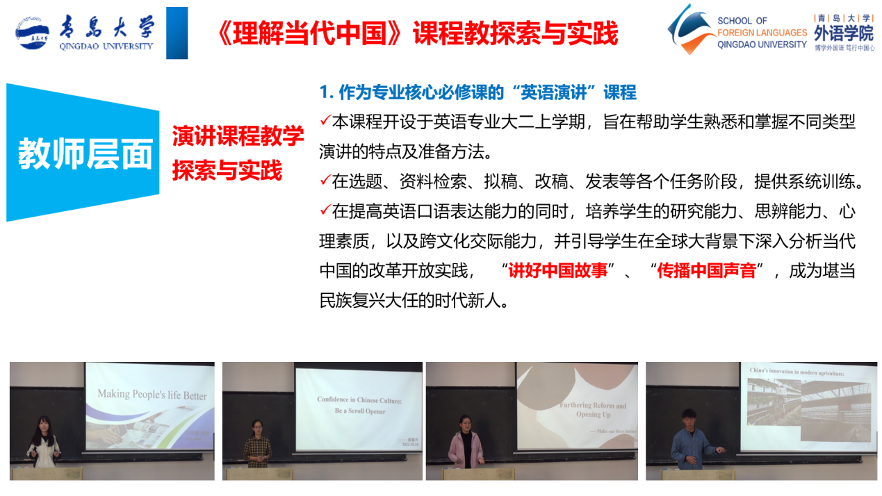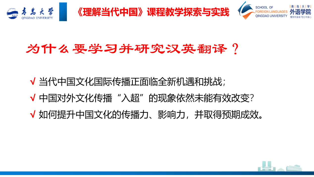 接下来,卞建华教授结合学院“汉英翻译”和“英语演讲课程教学探索与实践”课程教学经验,并选取部分学生课堂翻译案例和外语演讲备赛案例,展示了KY开元集团官网专业课程思政融合的最新教学成果。在今后的外语教学实践中,学院将继续依托《理解当代中国》系列教材,进一步加强学生的资料检索、翻译实践及语言生动呈现能力,同时将利用本校资源,联络国际留学生,做目标读者和听众分析问卷,邀请目标受众代表参加现场课堂教学、阅读翻译文本、倾听英语演讲,进行反馈互动,以教促研,以研促教,促学。