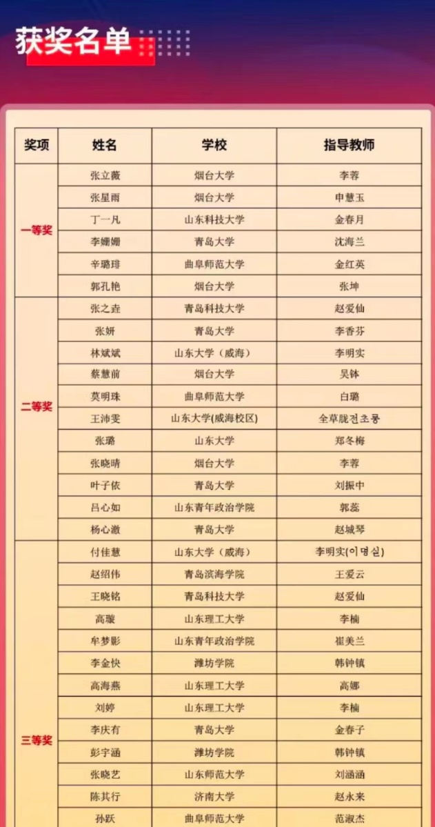 近日,庆祝中韩30周年山东省韩语演讲大赛(初赛)结果揭晓,我系学生在比赛中喜获佳绩,共有6位同学获奖。在山东省韩语演讲大赛总决赛中,我系李珊珊荣获二等奖。