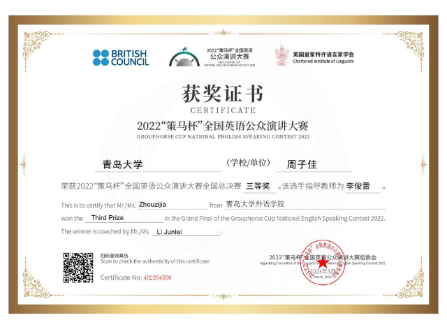 周子佳同学在经历南北大区赛的角逐后,脱颖而出,获得南北大区赛一等奖,顺利晋级总决赛。在总决赛中,第一回合进行了以“Cross Cultural Competence” 为题目的定题演讲,以十强进入第二回合,进行即兴演讲,最终获得全国三等奖。