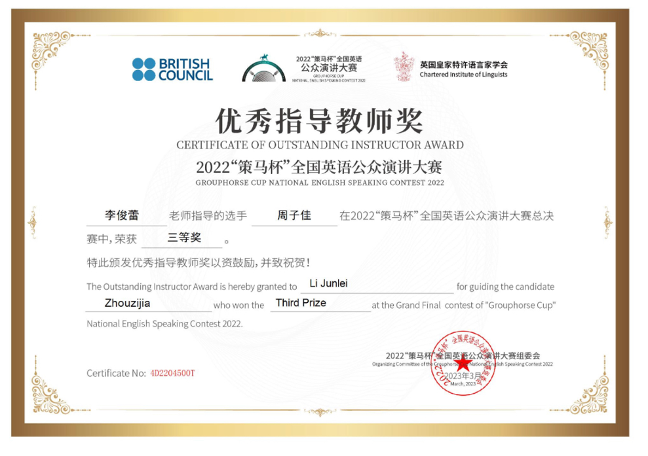 以下是选手及指导教师的获奖证书:
