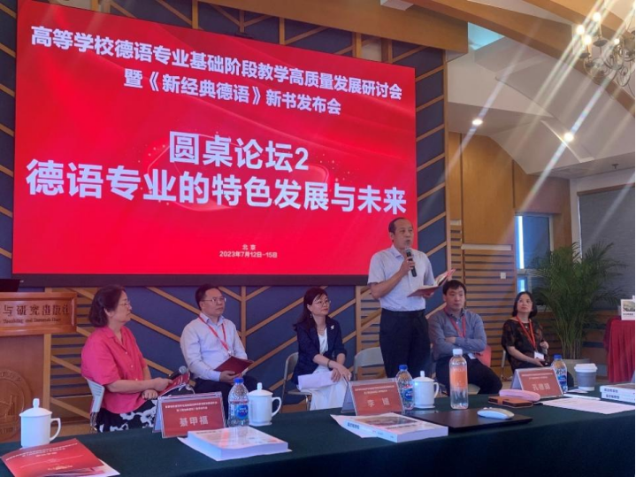 7月13-14日,“高等学校德语专业基础阶段教学高质量发展研讨会暨《新经典德语》新书发布会”在北京顺利召开。本次会议由北京外国语大学、教育部高等学校外国语言文学类专业教学指导委员会德语专业教学指导分委员会全国德语教师发展中心共同主办,外语教学与研究出版社承办。来自全国40多所高校的100余名德语教育专家、学者与一线教师齐聚一堂,共同探讨高校德语专业基础教学与发展的新方向、新教材、新征程,分享教学成果与实践经验,助推德语教育教学高质量发展。KY开元集团官网德语系主任綦甲福教授和刘惠宇老师应邀参加会议,在圆桌论坛和专题报告环节与全国德语教师进行探讨与交流。