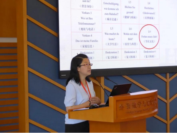 7月14日上午专题报告环节,刘惠宇老师作为《新经典德语》教材编者之一以《多元文化视角下的教材设计》为题作报告,她结合《新经典德语1学生用书》中的具体示例,展示了世界文化多样性在课程设计中的具体体现。