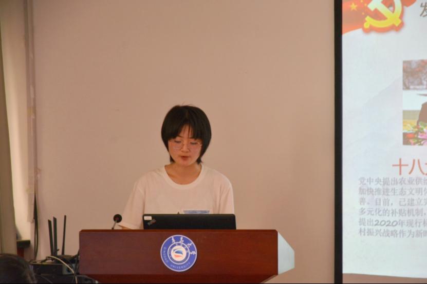 学生第一党支部赵慧琳以“乡村振兴路,永远跟党走”为主题,通过讲述上世纪八十年代农民的故事向我们阐述了建党一百年历程,中国共产党一直把依靠农民、为亿万农民谋幸福作为重要责任,并带领亿万农民走出了一条前所未有的、具有中国特色的农村发展之路。