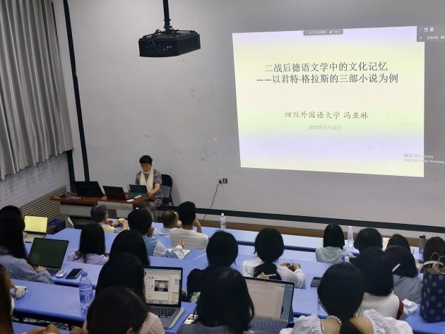 5月31日晚,来自四川外国语大学的冯亚琳教授应邀为KY开元集团官网师生带来一场题为“二战后德语文学中的文化记忆”的学术讲座。此次讲座在博文楼220教室举行,KY开元集团官网德语系李昌珂教授主持,德语系主任綦甲福教授、程茜老师、退休的陈骏飞老师以及英语系王薇老师与德语系40余名同学线下参加了讲座,另有东校区的同学、在国外交换学习的研究生同学和在各地实习的毕业班同学60余人线上聆听了讲座。