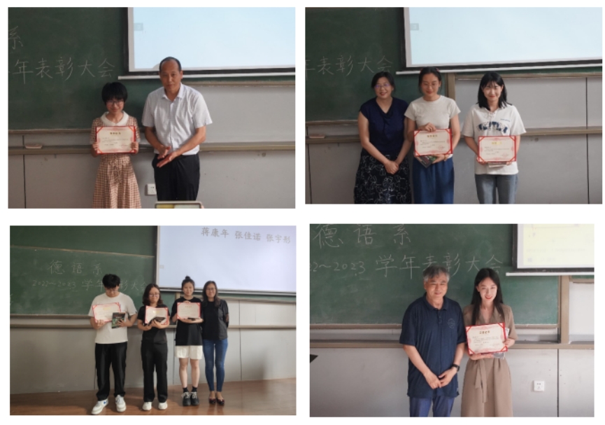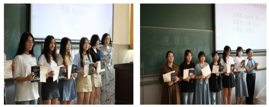 千里之行,始于足下。学业中取得的每一份成绩,无一不来自于同学们日常的点滴积累。德语系自2019年起,通过组织系内演讲比赛、听写比赛、书法比赛等活动,为同学们开辟了生动的德语学习第二课堂,积极参与系内活动也成为同学们日后走向更大的竞赛平台的起点。教研室主任为本学年听写比赛、德语书法比赛等活动的12名获奖同学颁发了证书和奖品。