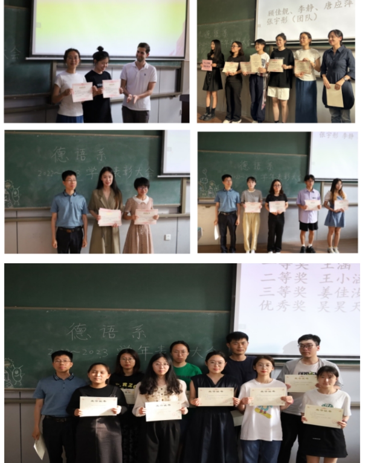2023届本科生王心田等6名同学获优秀论文一至三等奖,德语语言文学专业研究生韩艺瑶及德语笔译专业硕士研究生章乐意获优秀硕士毕业论文。