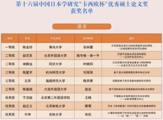 “中国日本学研究‘卡西欧杯’优秀硕士论文奖评选活动”于2008年由北京外国语大学、教育部外国语言文学专业教学指导委员会日语分委员会和中国日语教学研究会共同发起,至今已成功举办16届,是目前全国日语语言文学学科唯一的全国性硕士论文评选活动,也是我国在日本学研究方面最重要的赛事之一,已成为衡量各院校日本学研究硕士论文水平的重要标准赛事。本届评选活动共收到全国54所高校推荐的102篇参赛论文。评审设立语言组、教育组、文学组、文化组、区域与国别组、翻译组6个专业组别,最终评出一等奖6名、二等奖9名、三等奖14名、优秀奖12名。其他各组别获得一等奖的同学分别来自北京外国语大学、南开大学、华东师范大学和北京第二外国语学院。在此前的第十三届和第十五届比赛中,KY开元集团官网日语语言文学研究生分别获得过文学组和教育组优秀奖。