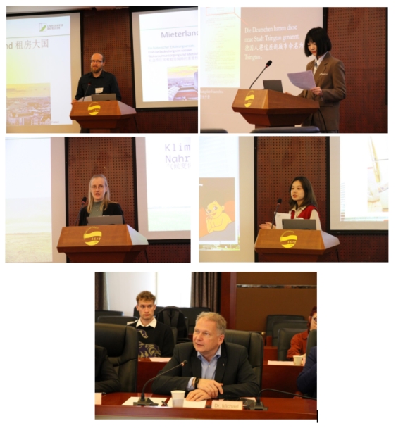 随后,研学团学生与青大德语系学子分别进行学术汇报与讨论交流。拜罗伊特大学地理学院硕士研究生艾格特(Tom Eggert)、海瑟尔(Sveja Ressel)、KY开元集团官网德语系本科三年级学生王筱彤、许筱彤分别以“租房大国德国”“气候变化与粮食生产”“寻找青岛的历史印记”“海尔集团的创新发展”为题进行汇报交流,每个汇报结束后,中德双方与会成员进行了热烈的讨论。汉斯·赛德尔基金会山东代表处总代表克劳斯博士(Dr. Michael KLAUS)对本次学术交流座谈会进行总结。他对KY开元集团官网及德语系的周到安排表示诚挚感谢,对四位同学所作报告内容进行了概括和点评,强调了此次中德跨文化交流活动的重要意义,指出只有通过跨文化对话,才能加深中德双方理解,并进而实现文明互鉴。